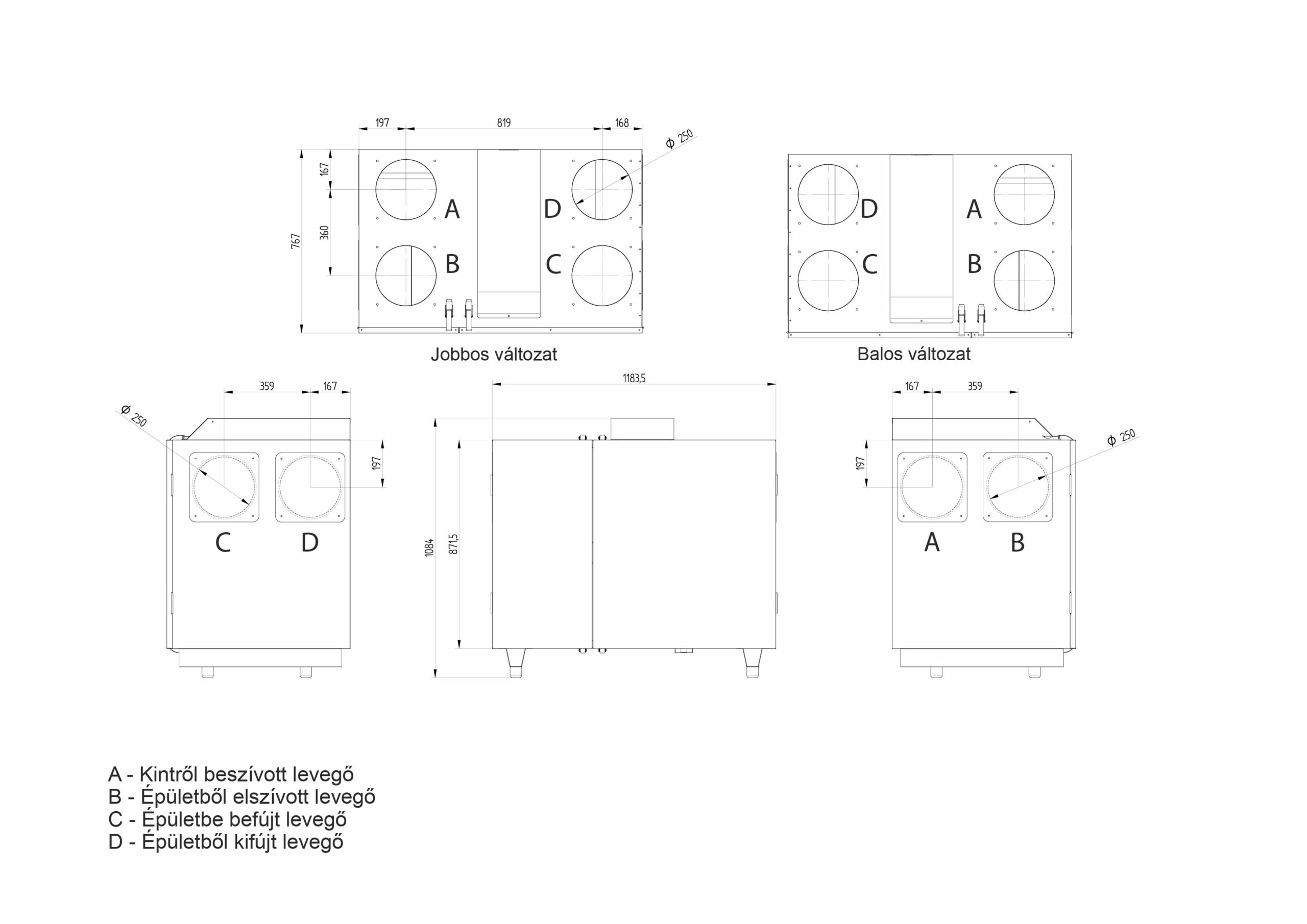 Maximális légszállítás: 800 m³/h (ajánlott ≤ 360 m² alapterületre)