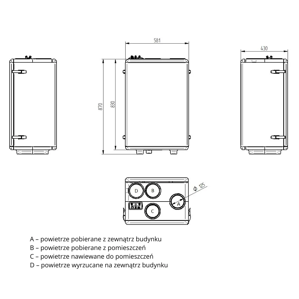 Méretek: 581 × 430 × 870 mm (szélesség × mélység × magasság)