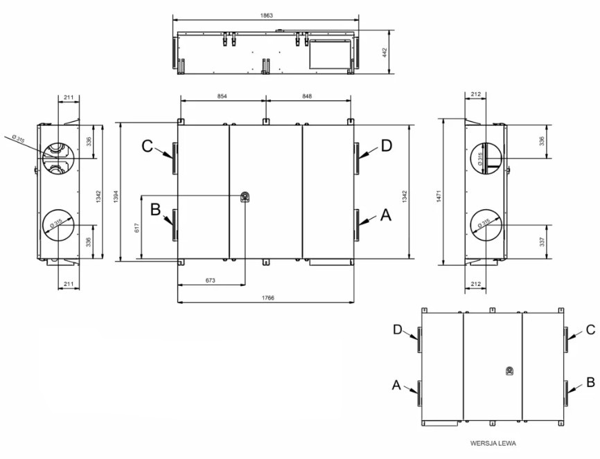 • Maximális légszállítás: 1345 m³/h (ajánlott ≤ 540 m² alapterületre)